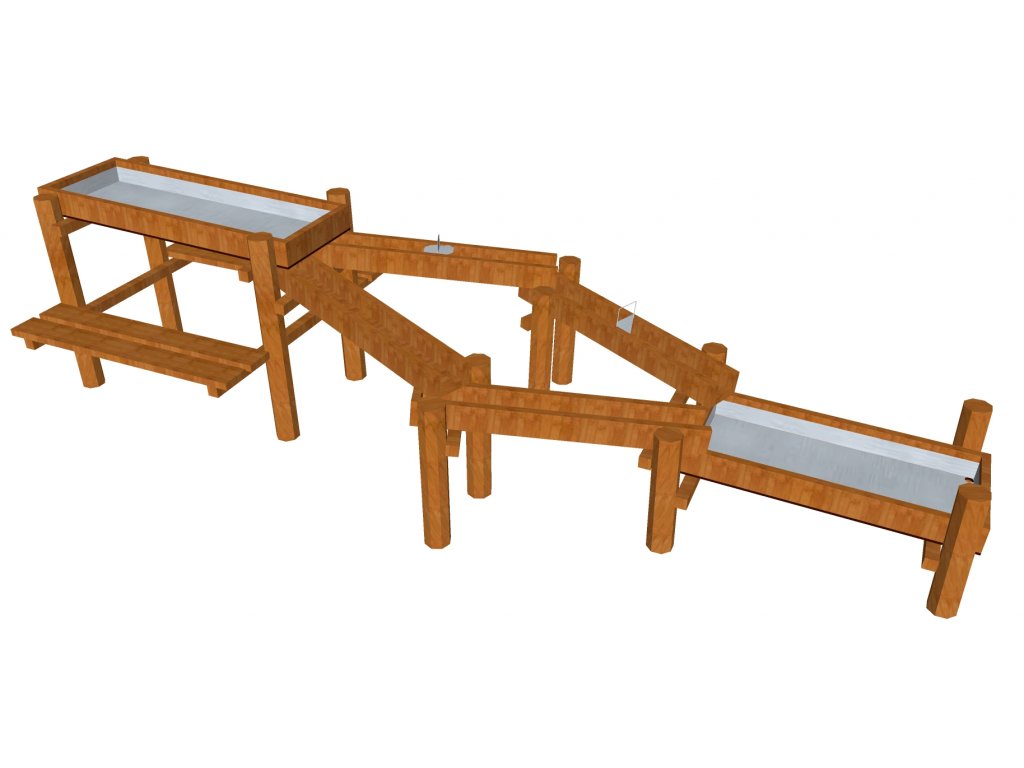 Hra s vodou, vodními mlýnky, stavidly - vodní prvek je skvělý na přírodní zahradu v MŠ. Prvek tvoří soustava dřevěných korýtek a van. Děti tekoucí voda baví, fascinuje a v horkých dnech navíc příjemně osvěží.